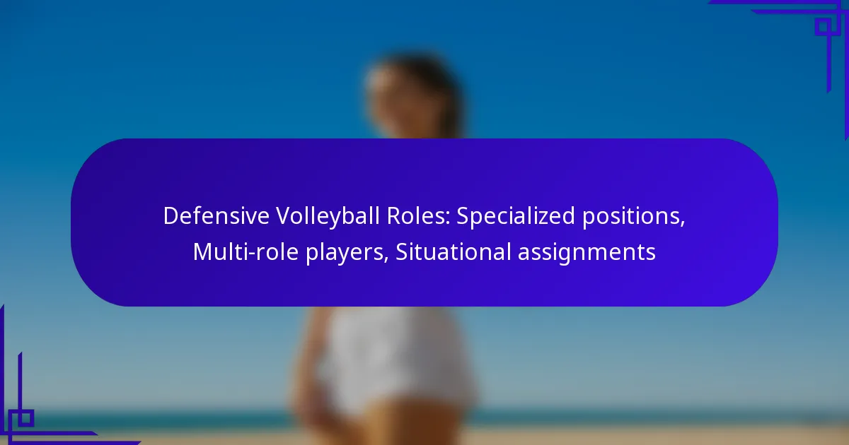 In volleyball, defensive roles are crucial for maintaining effective ball control and strategic play, primarily represented by specialized positions like the libero and defensive specialist. Multi-role players add flexibility to the defense, allowing teams to adapt to various game situations. Additionally, situational assignments enable coaches to tailor player responsibilities based on opponents’ strengths, enhancing overall team performance and resilience.